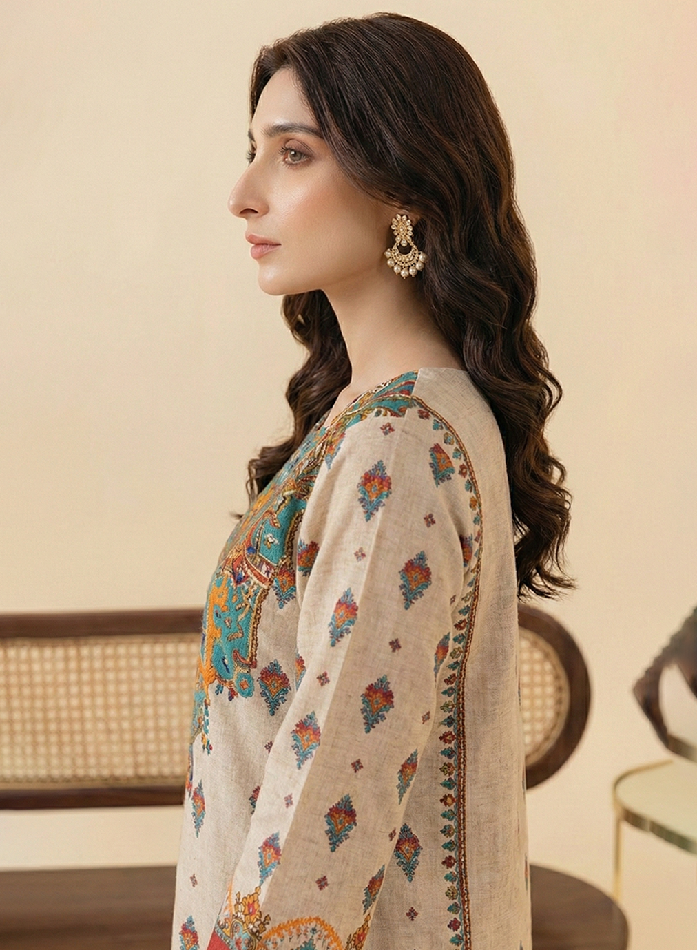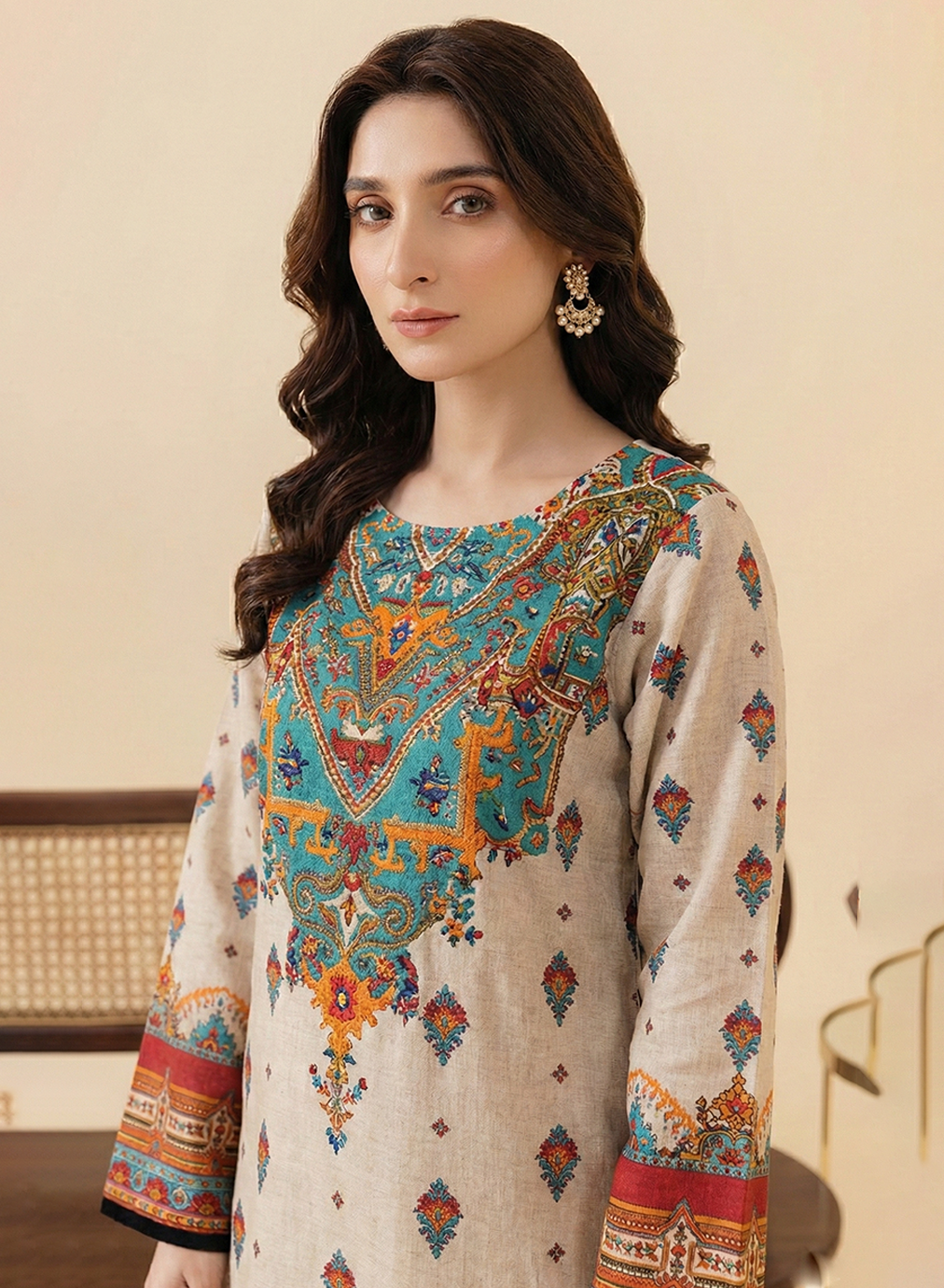 Design: The shirt features a soft oatmeal base enhanced by a vibrant turquoise and orange embroidered neckline, detailed with traditional central Asian and ethnic geometric patterns.