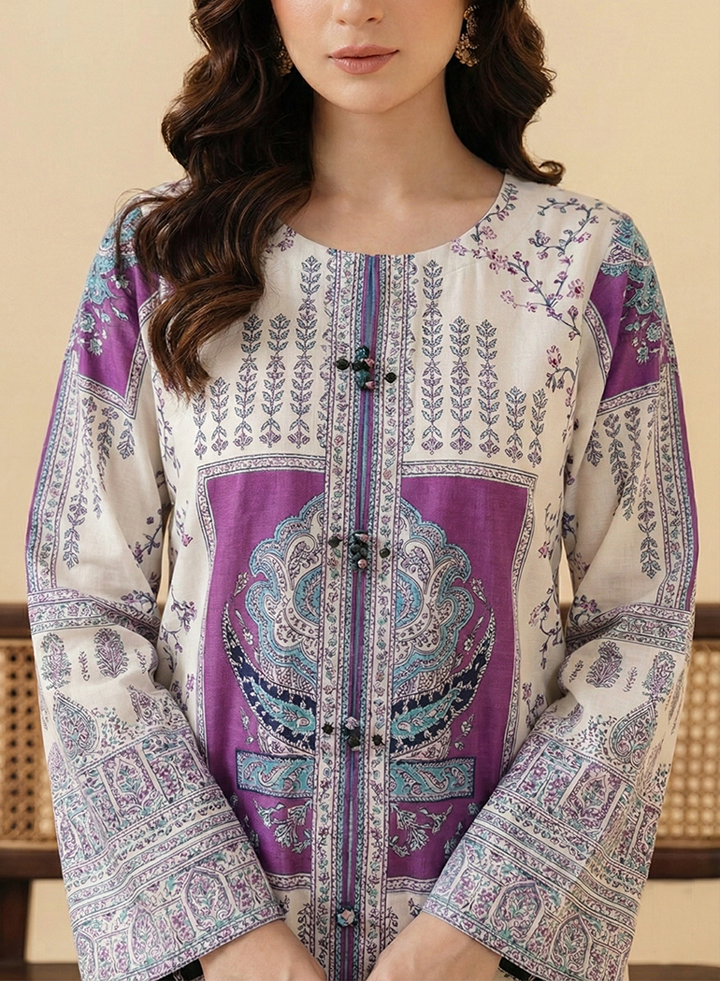 Shirt: A digital printed shirt featuring a narrow band collar with decorative black knotted button detailing and wide-cut sleeves with intricate grey and purple borders.