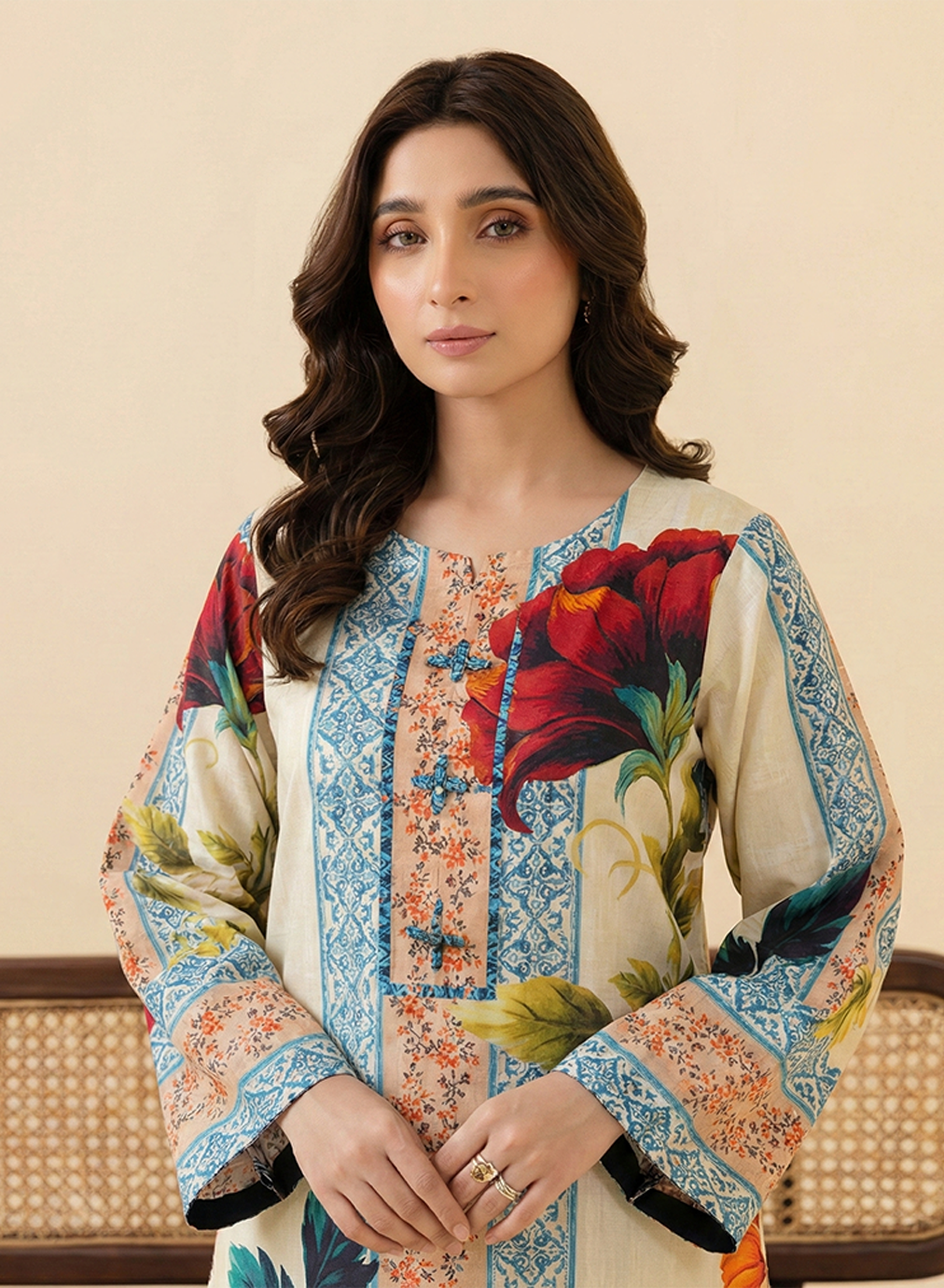 Design: The shirt features a cream-colored base enriched with vintage-inspired vertical panels of blue filigree and peach floral patterns, dominated by large, vibrant red rose illustrations.